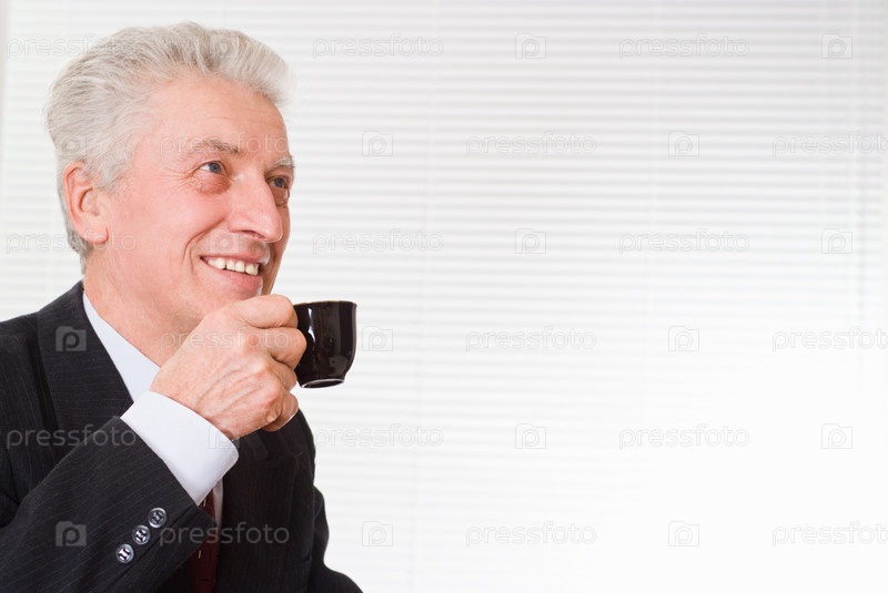Портрет улыбающегося пожилого бизнесмена с кофейной чашкой в руке