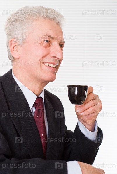 Портрет улыбающегося пожилого бизнесмена с кофейной чашкой в руке