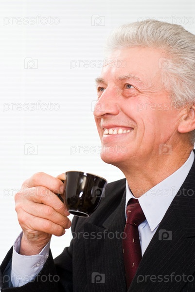 Портрет улыбающегося пожилого бизнесмена с кофейной чашкой в руке