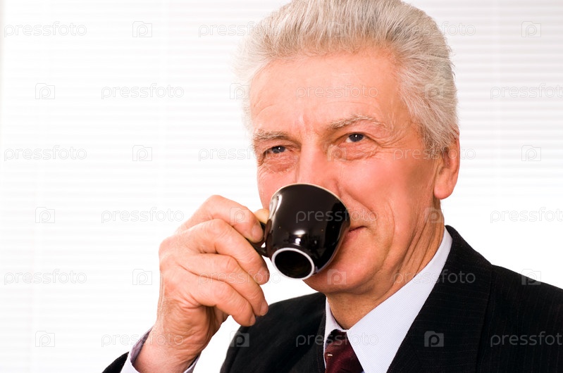 Портрет улыбающегося пожилого бизнесмена с кофейной чашкой в руке