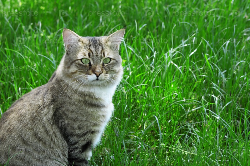 Кошка на фоне зеленой травы
