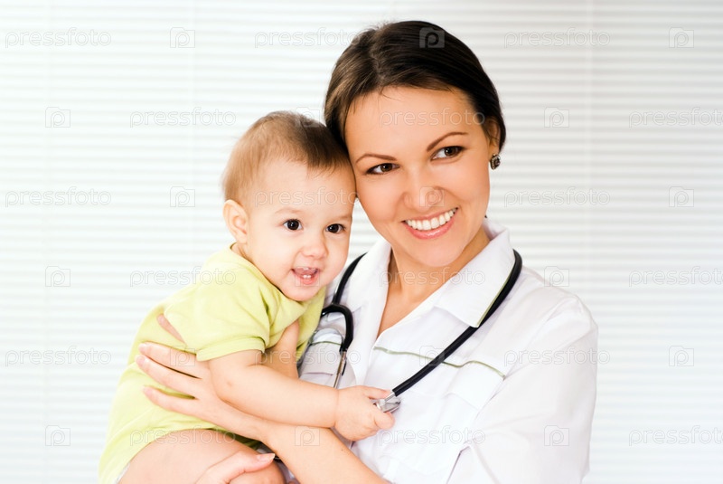 Женщина-врач с младенцем, на белом фоне