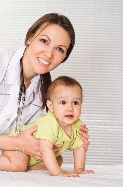 Женщина-врач с младенцем, на белом фоне