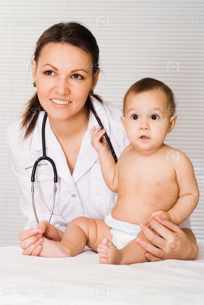 Женщина-врач с младенцем, на белом фоне