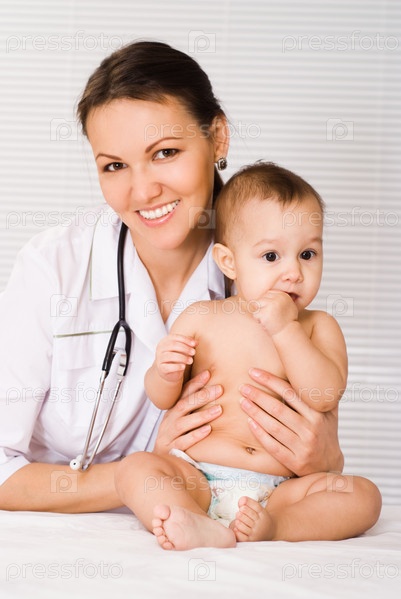 Женщина-врач с симпатичным младенцем, на белом фоне