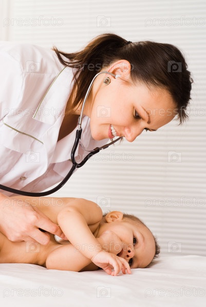 Детский врач обследует младенца стетоскопом