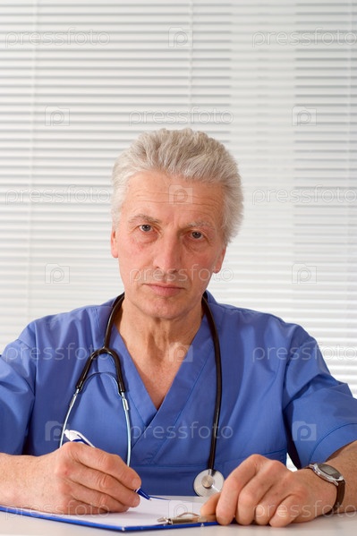 Мужчина-врач, делающий запись за столом