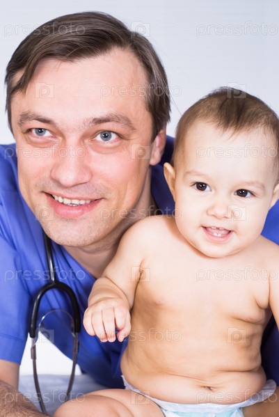 Счастливый доктор с новорожденным ребенком