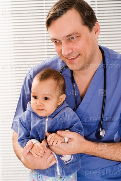 Счастливый доктор с младенцем на руках