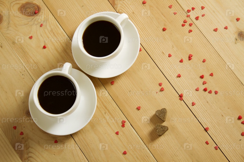 Две чашки кофе и мелкие сердечки на деревянном полу