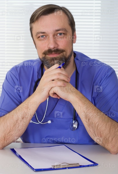 Красивый доктор, сидя за столом