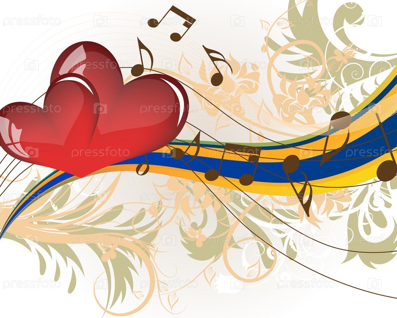 Абстрактные фон с объемными сердцами,завитками,лентами и нотами