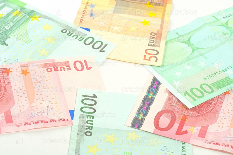 Банкноты евро лежат по кругу на белом фоне