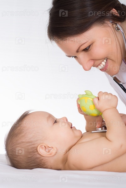 Молодая женщина врач, осматривающая младенца