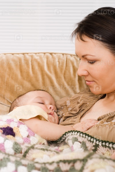Маленький ребенок, спящий у матери на груди