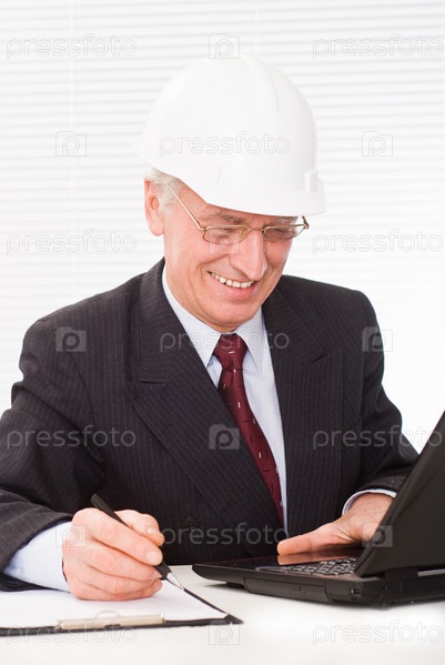 Деловой мужчина в строительной каске работает с ноутбуком