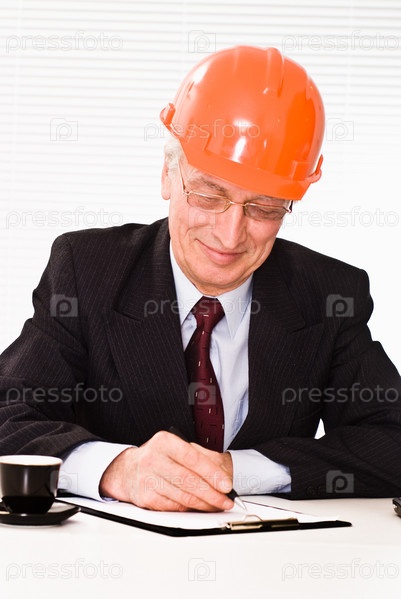 Пожилой инженер- строитель в каске пишет сидя за столом