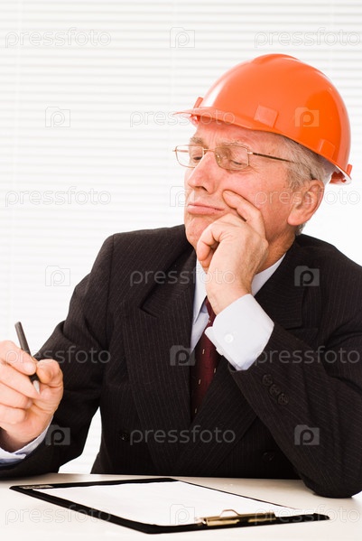 Пожилой инженер- строитель в каске, сидит за столом