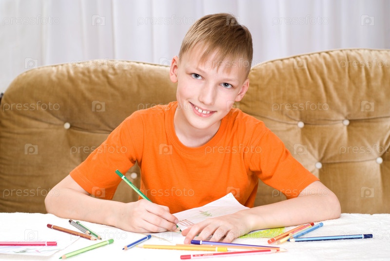 Мальчик в оранжевой футболке, рисует за столом