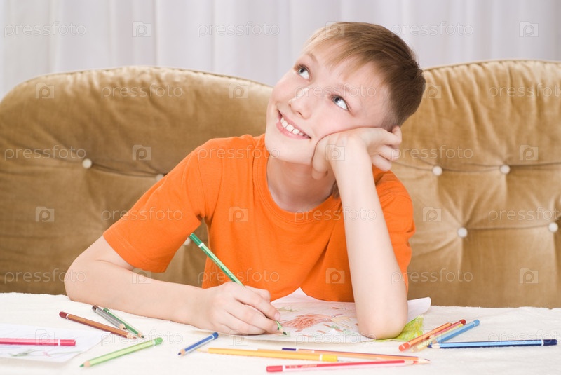 Мальчик в оранжевой футболке, рисует за столом