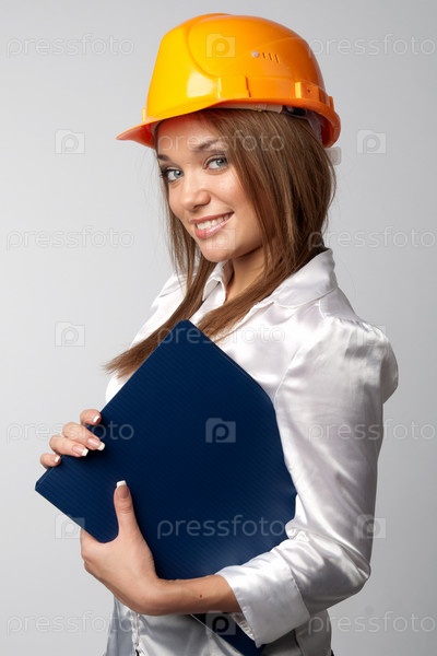 Женщина в каске с папкой на белом фоне