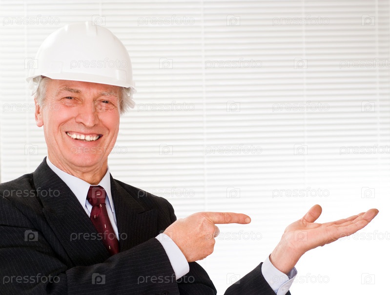 Пожилой строитель на белом фоне