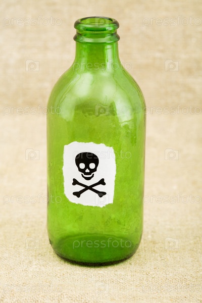Зеленая бутылка с наклейкой череп и крестовые кости на сакинге