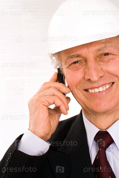 Пожилой строитель в белой каске, разговаривающий по телефону