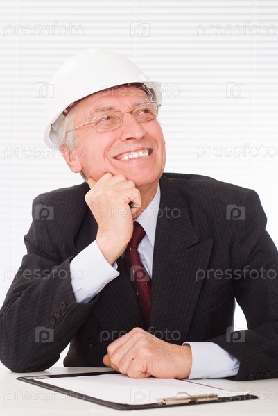 Пожилой строитель в каске, работающий над проектом