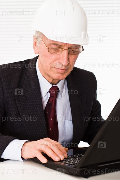 Пожилой строитель в каске, работающий за ноутбуком