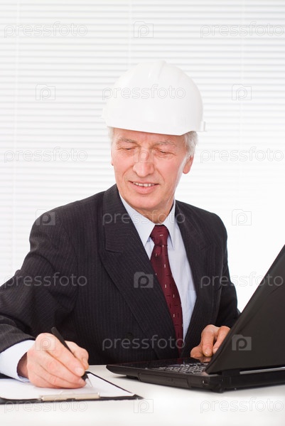 Пожилой строитель в каске, работающий за ноутбуком