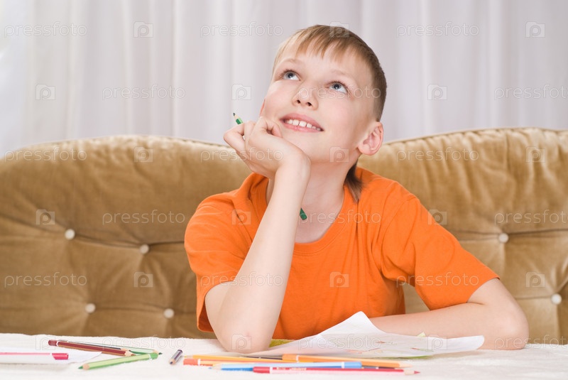Мечтательный маленький мальчик, рисующий за столом