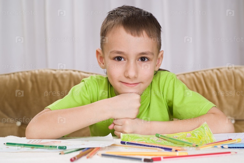 Мечтательный мальчик в зеленой футболке
