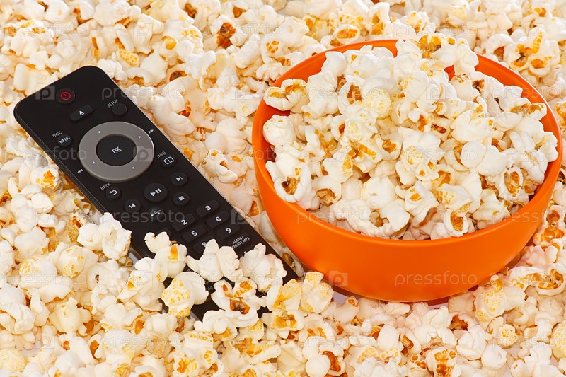 Попкорн, в оранжевой чашке и пульт дистанционного управления на фоне попкорна