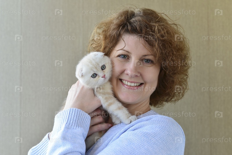 Бежевый котенка в руках женщины