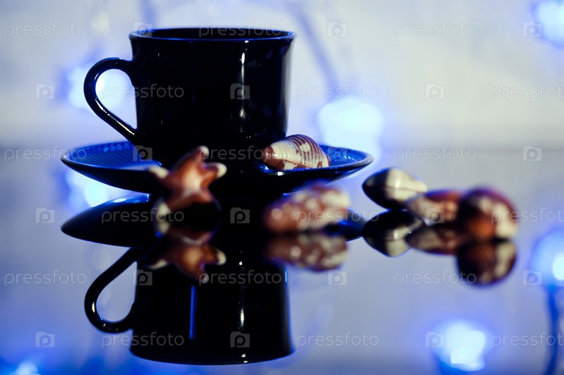 Натюрморт с черной чашкой и шоколадными конфетами