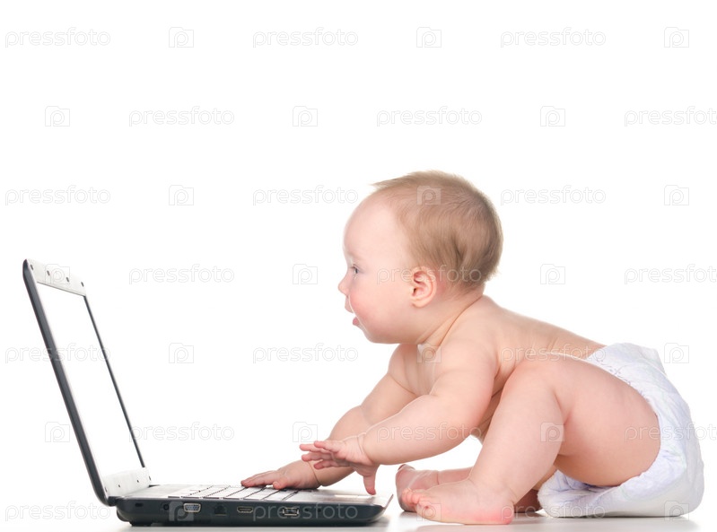 Маленький ребенок работает на ноутбуке на белом фоне