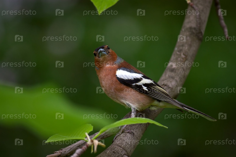 На ветке дерева сидит зяблик на зеленом фоне