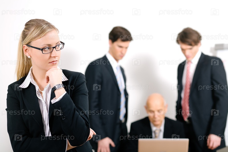 Бизнес-леди на фоне деловых людей за ноутбуком