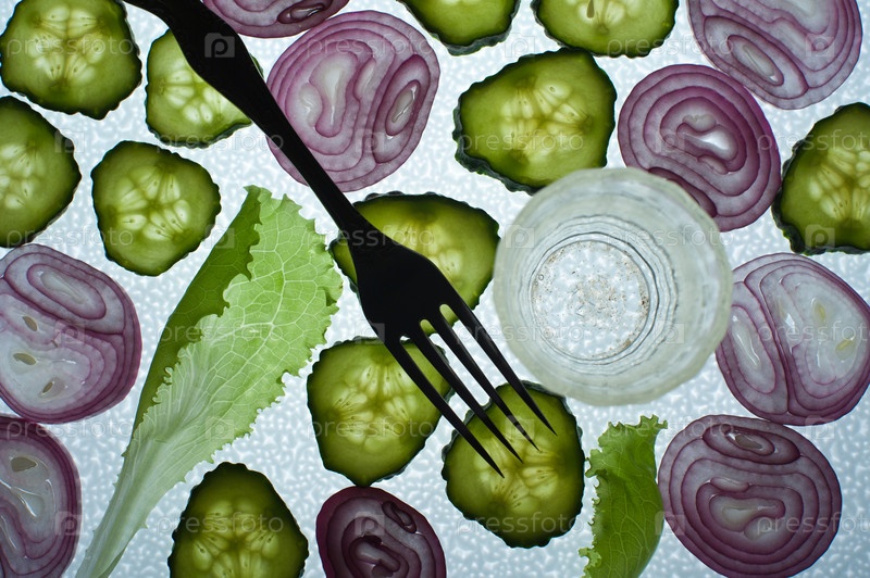 Огурцы, лук и листья салата на белом фоне