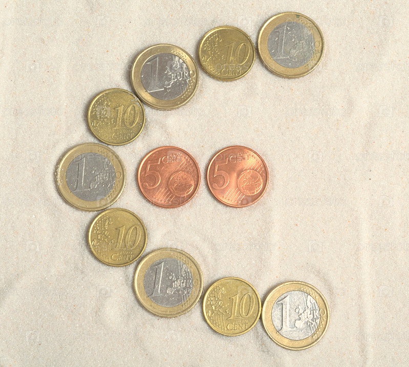 Символ евровалюты выложен из евроцентов на песке