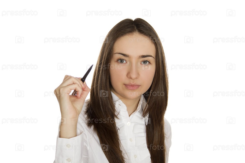 Деловая женщина с ручкой в руке на белом фоне