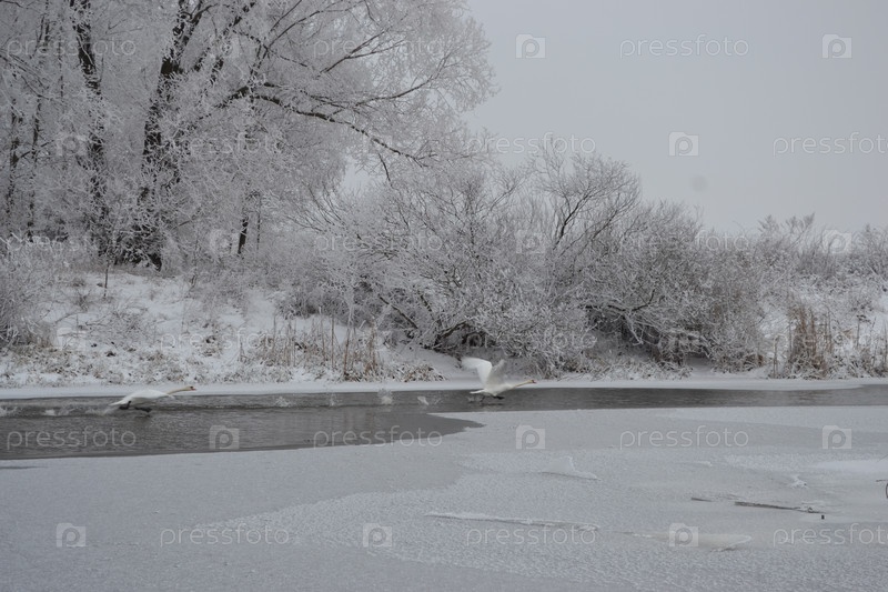 Беларусь. Минская область, река Случь. Взлетающая лебединая пара