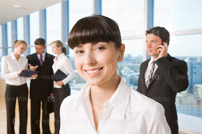 Портрет счастливой бизнес-жены, улыбающейся в камеру на фоне работающих сотрудников