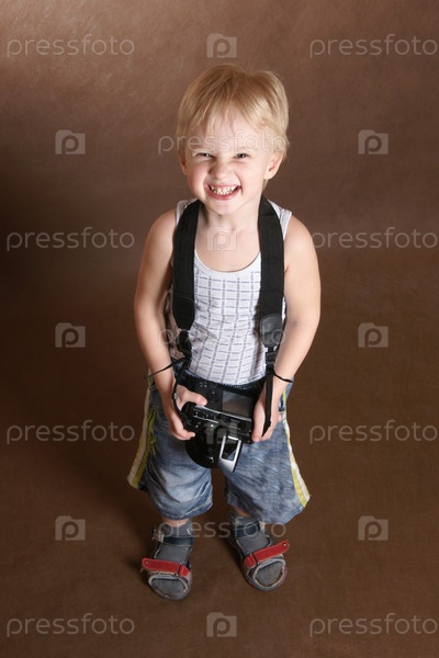 Веселый мальчик с фотоаппаратом стоит на коричневом полу
