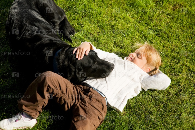 Маленькая девочка лежит на траве с собакой
