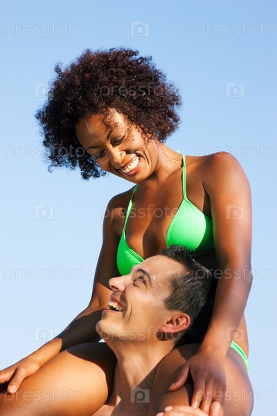 Молодой человек держит свою подругу на плечах