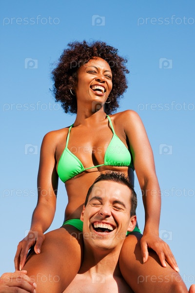 Молодой человек держит свою подругу на плечах