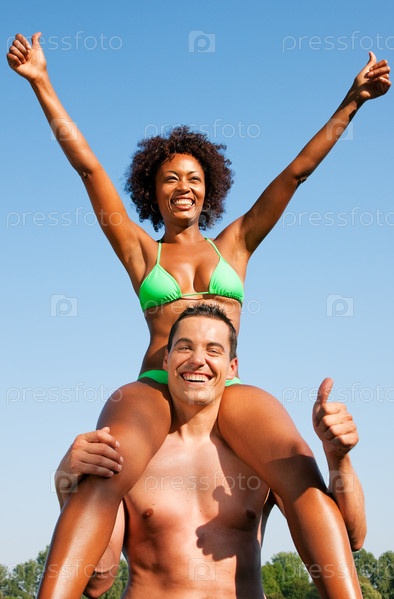 Молодой человек держит свою подругу на плечах