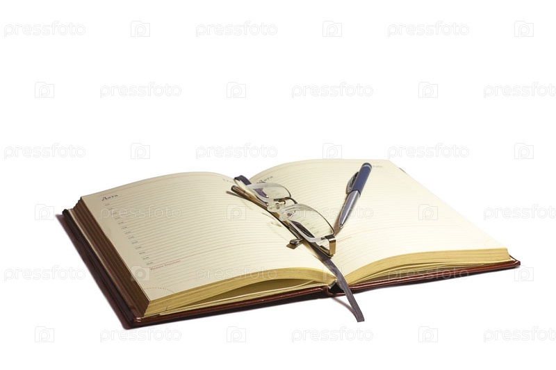Ноутбук с записями, шариковой ручкой и очками на изолированном белом фоне